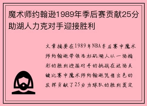 文章摘要:在1989年NBA季后赛中,魔术师约翰逊带领洛杉矶湖人以一场精彩的胜利迎接对手的挑战。在这场关键比赛中,魔术师约翰逊凭借出色的发挥贡献了25分,为球队的胜利奠定了基础。本文将从四个方面详细探讨魔术师约翰逊在1989年季后赛中的精彩表现。首先,分析魔术师约翰逊在这场比赛中的得分表现,展现他在关键时刻的得分能力。其次,探讨魔术师约翰逊在比赛中的领导力和场上组织能力,如何在压力之下带领湖人队保持稳定的进攻节奏。第三,回顾他在防守端的表现,如何通过个人防守和全队协作有效限制对手的进攻。最后,探讨这场胜利对湖人队季后赛之路的影响,以及魔术师约翰逊的关键贡献在整个赛季中的重要性。通过这些方面的分析,本文将全面呈现魔术师约翰逊在1989年季后赛中的非凡表现,以及他对湖人队的巨大影响。